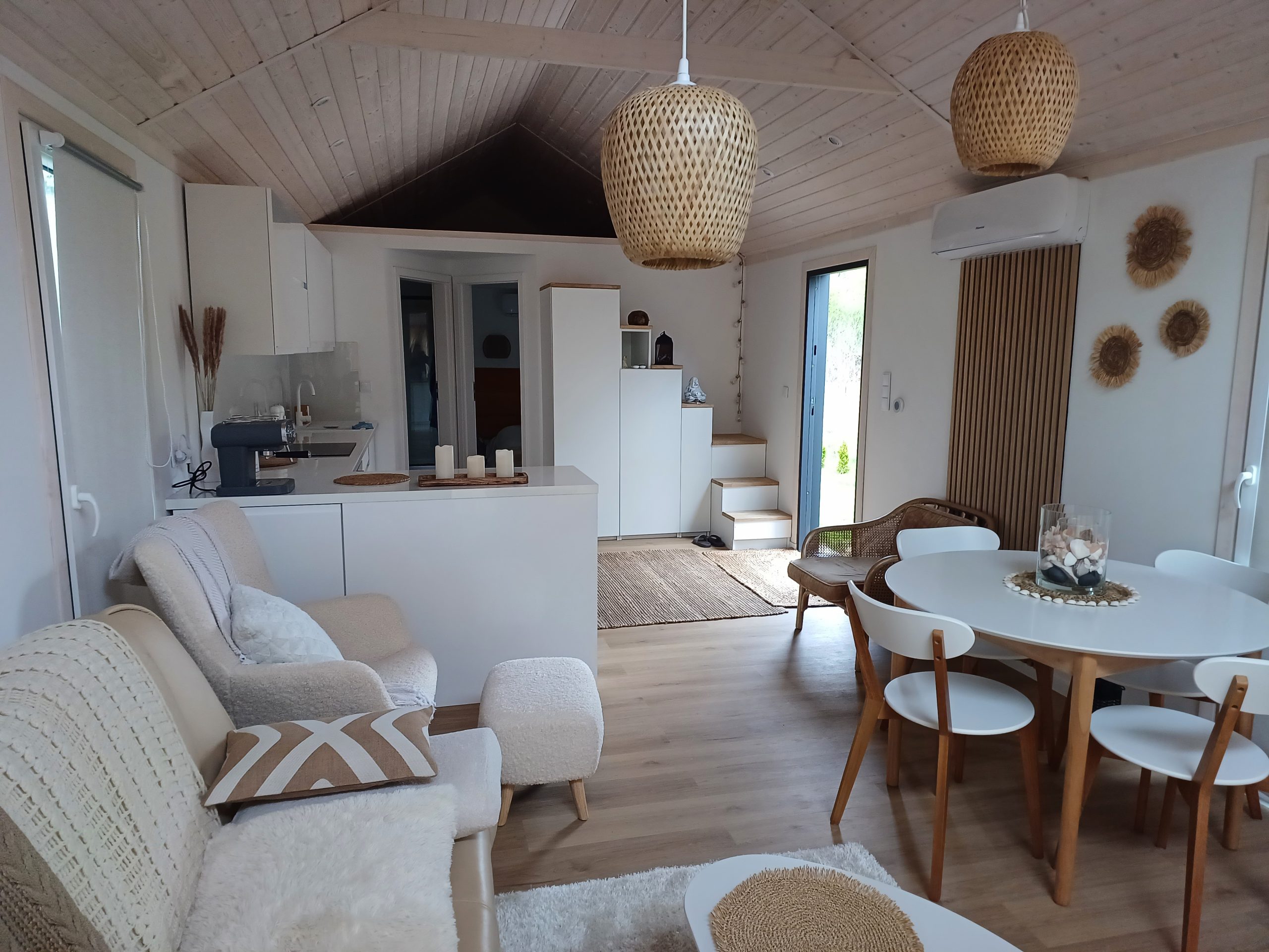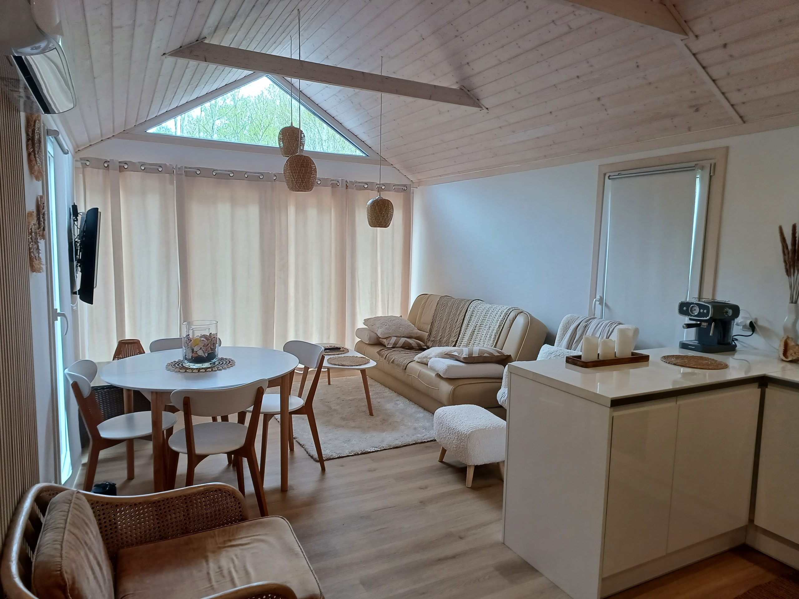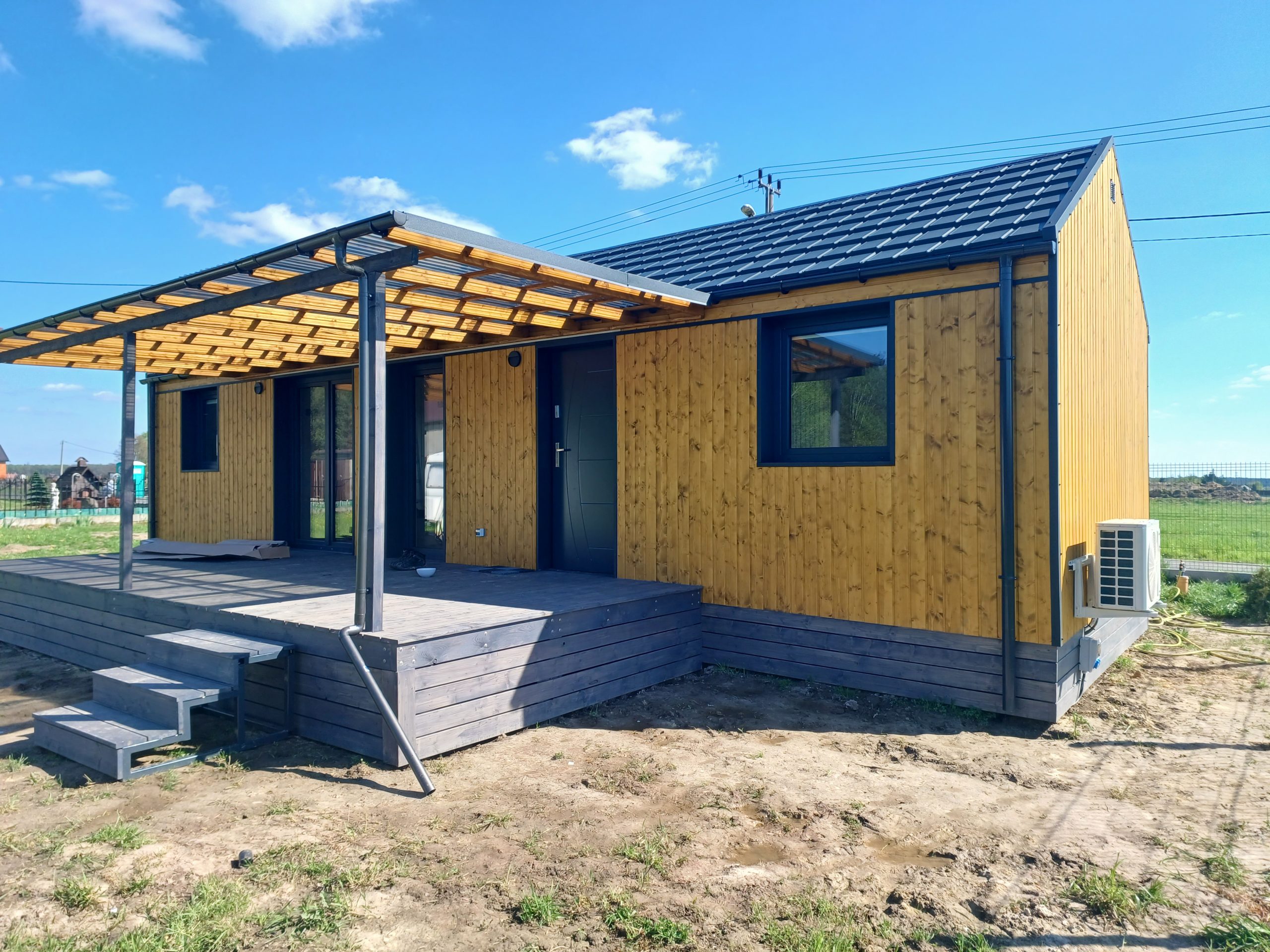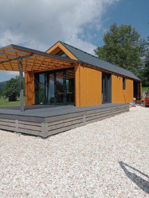 Functionality, aesthetics, and complete comfort are ensured by the steel-wood construction, the wood used inside, modern vinyl cladding, as well as the Scandinavian spruce and anthracite sheet metal used as exterior materials.