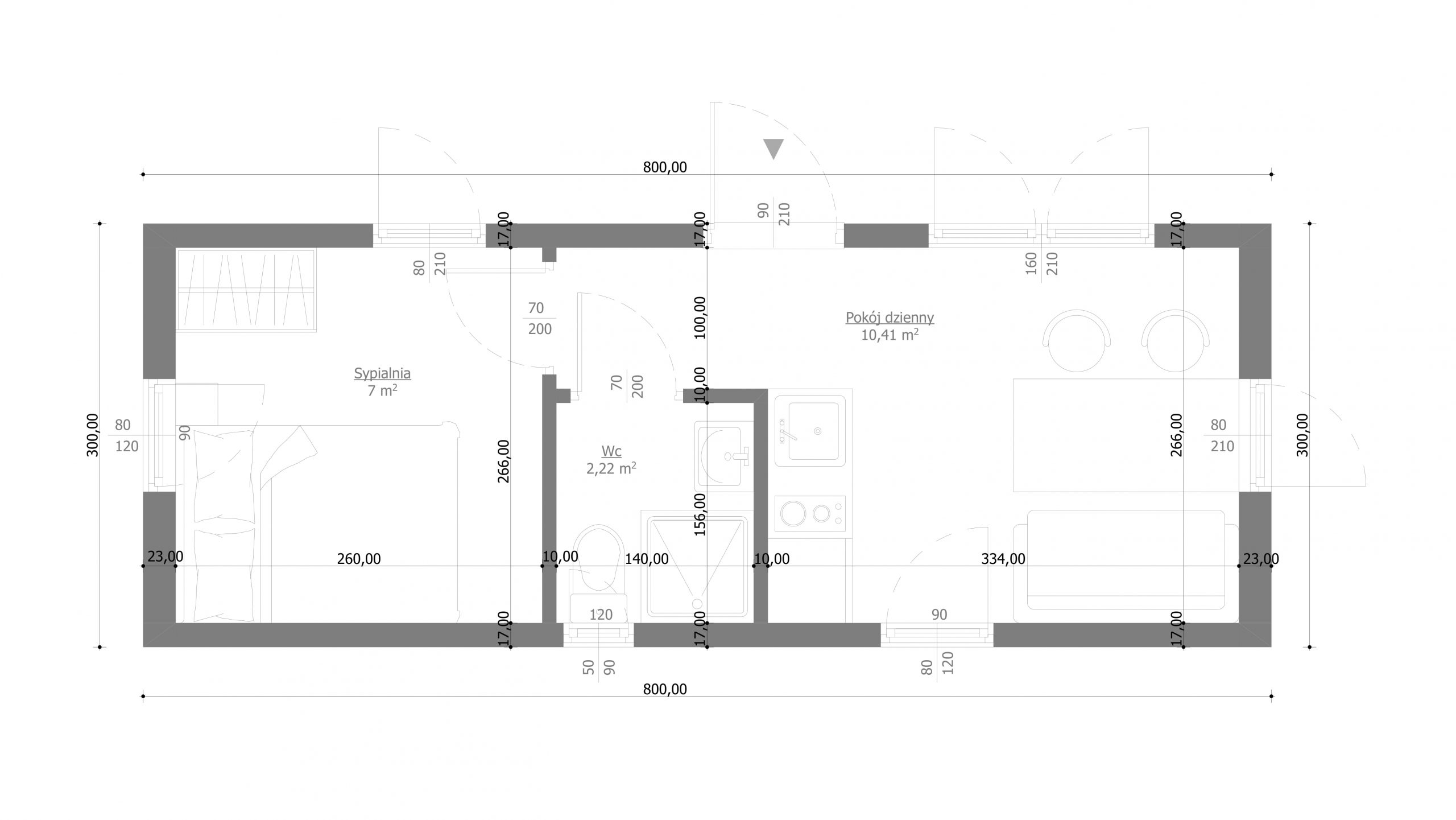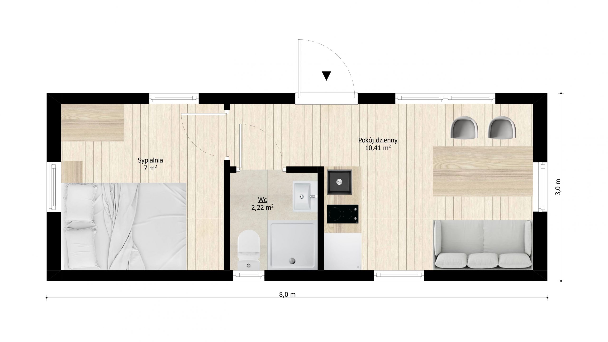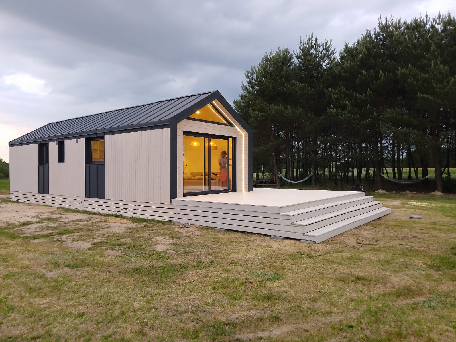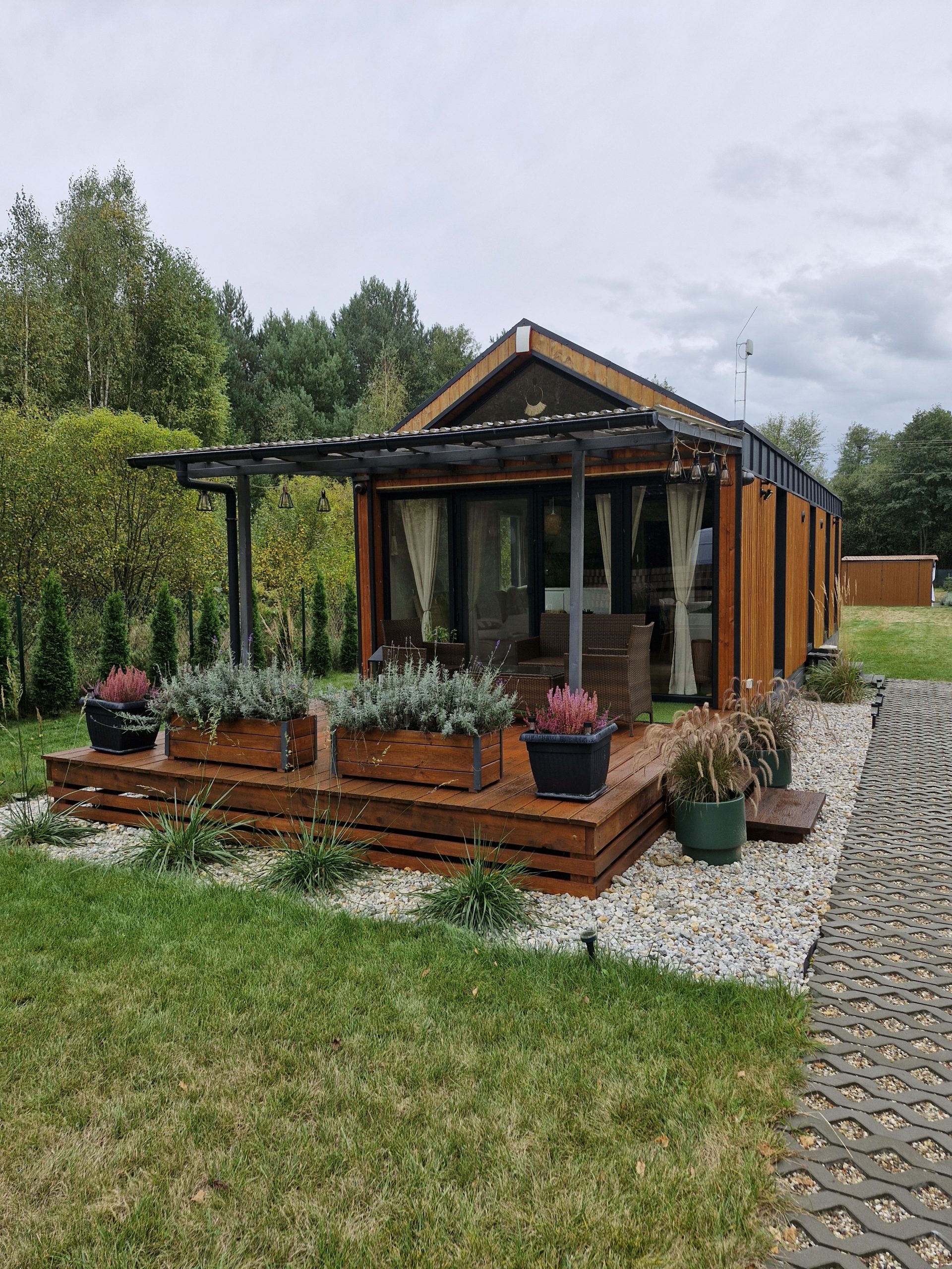 A year-round house delivered to the site ready for use.Version for 2 people: bedroom, mezzanine, living room with a sofa bed, kitchenette, and bathroom.Usually does not require a building permit.Also available in an economical – summer version.Turnkey or developer finish.Durable and rigid steel-wood construction.Exterior materials – Scandinavian spruce and anthracite standing seam metal.Interior materials – modern vinyl coverings and wood.Placed on-site using a wheeled system or crane.Optional: terrace, covered pergola.