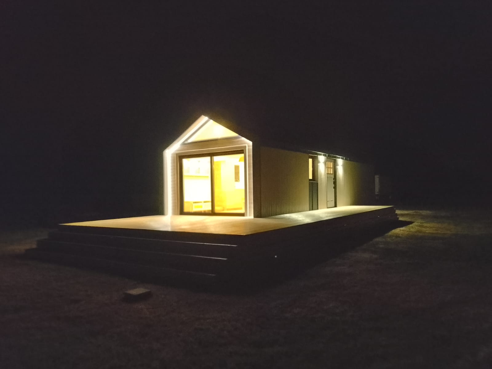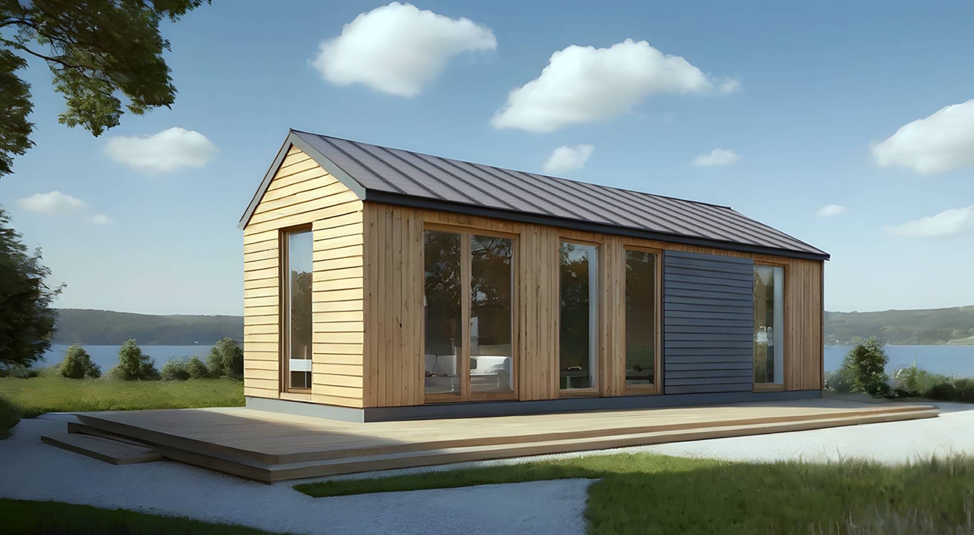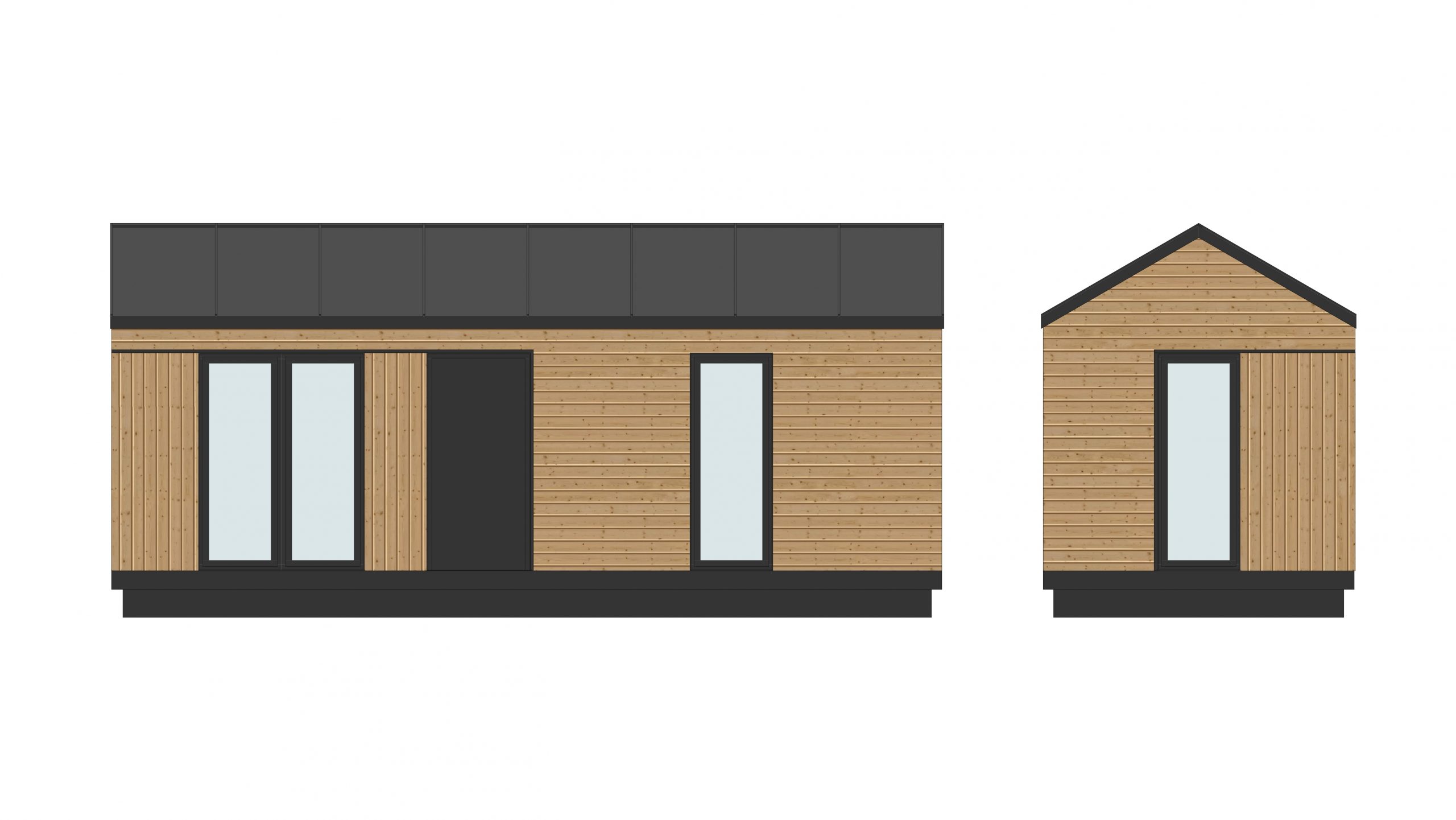 Steel with wooden elements. The building has two axes of removable wheels (in the mobile version).RoofSingle-pitched, finished with steel roof tiles or standing seam metal sheets. Eaves, gutters, and downspouts (visible or hidden). Layers are listed from bottom to top – ceiling finishing cladding, OSB boards, roof trusses, PUR foam insulation, vapor-permeable membrane, ventilated air gap, auxiliary framework, roofing.