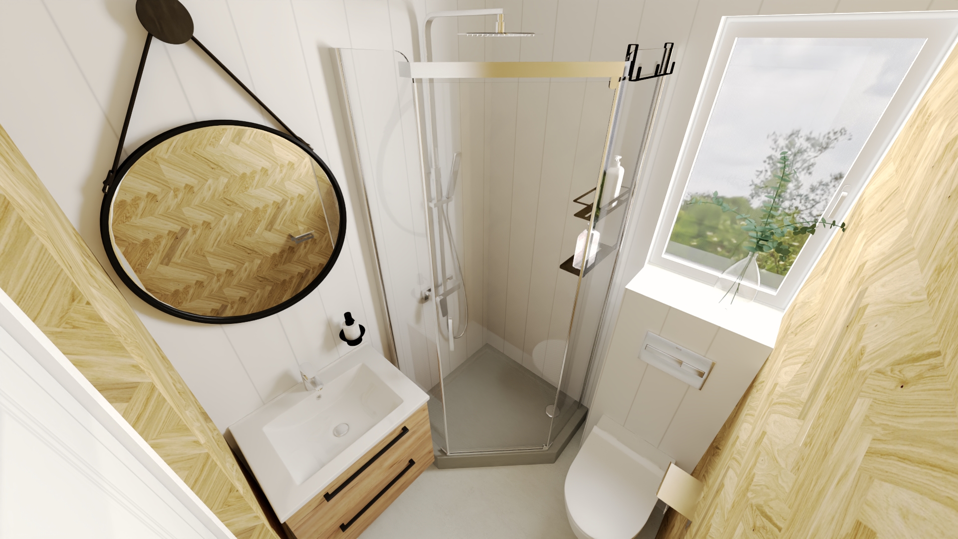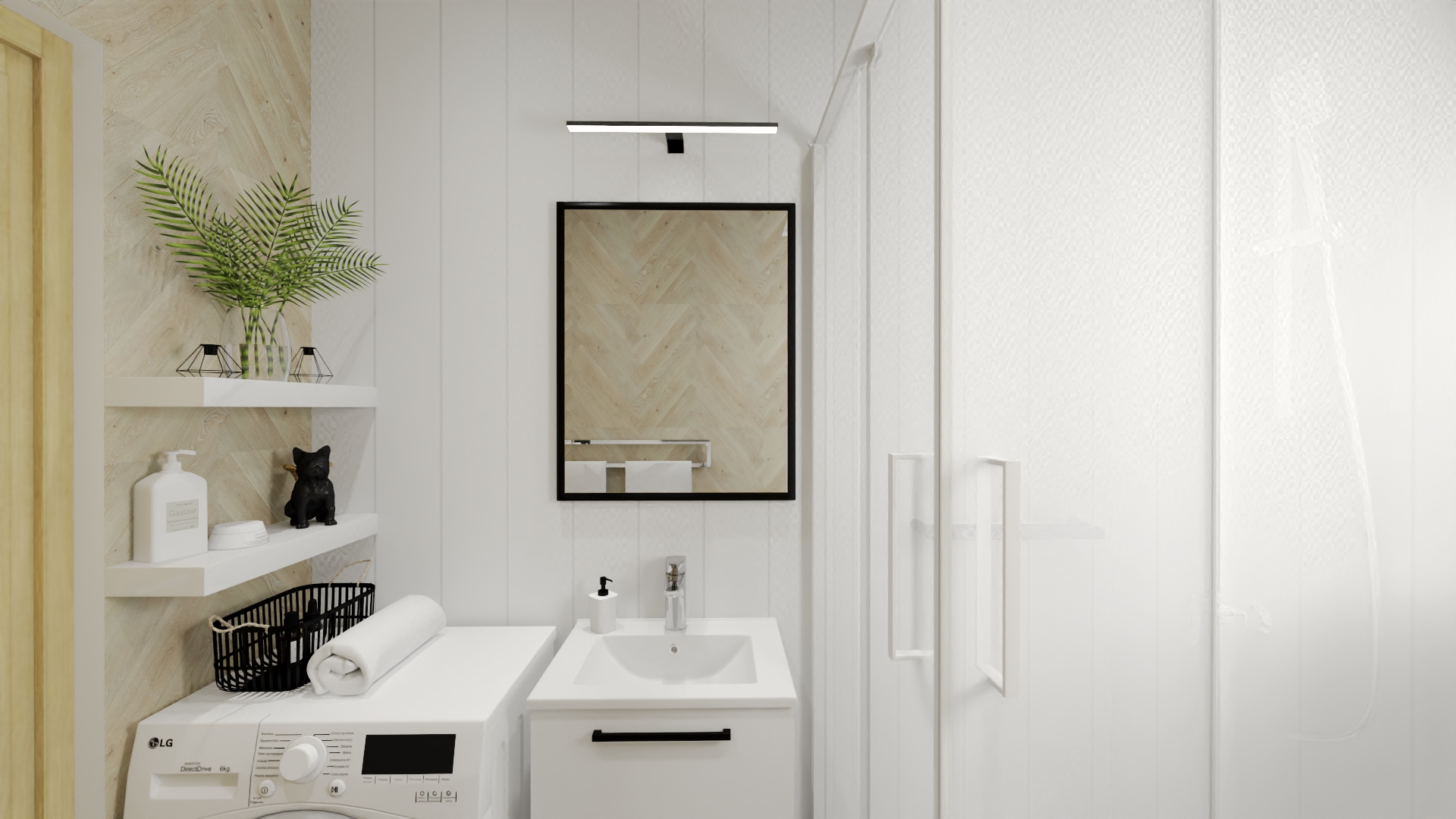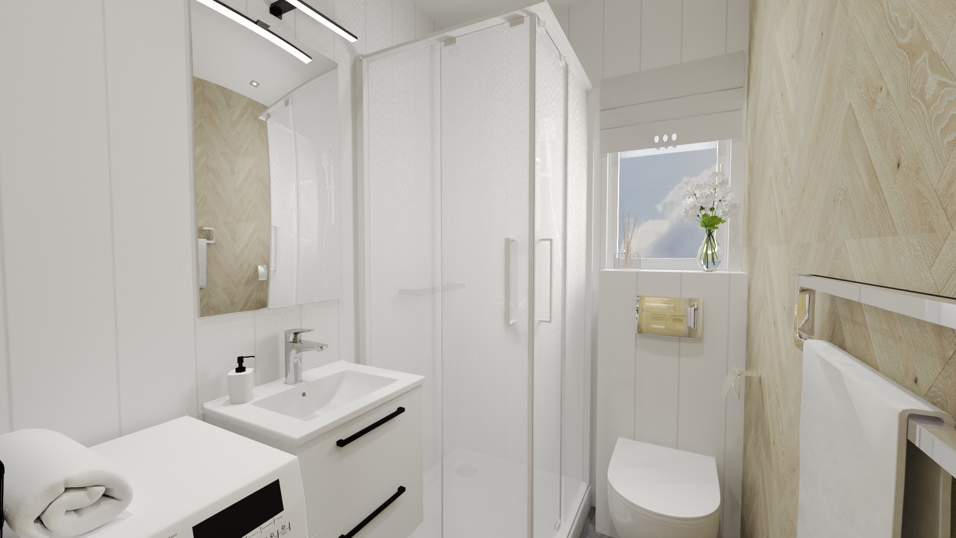 Floor and wall finishes – waterproof vinyl panels.The room is prepared for the installation of fixtures, optionally – a version with full installation (sink, toilet, shower cabin, washing machine, water heater (flow-through/boiler), bathroom cabinets)
