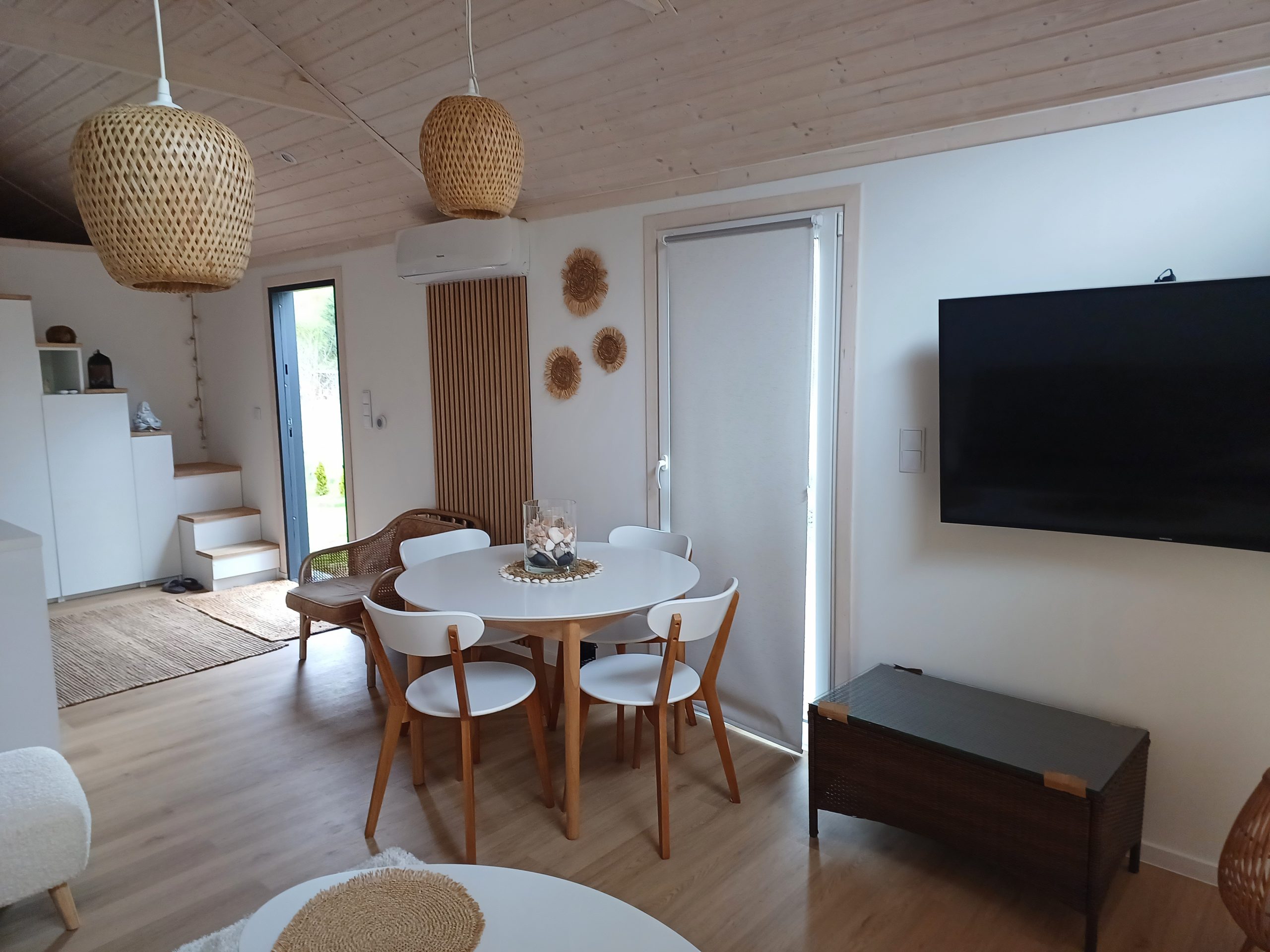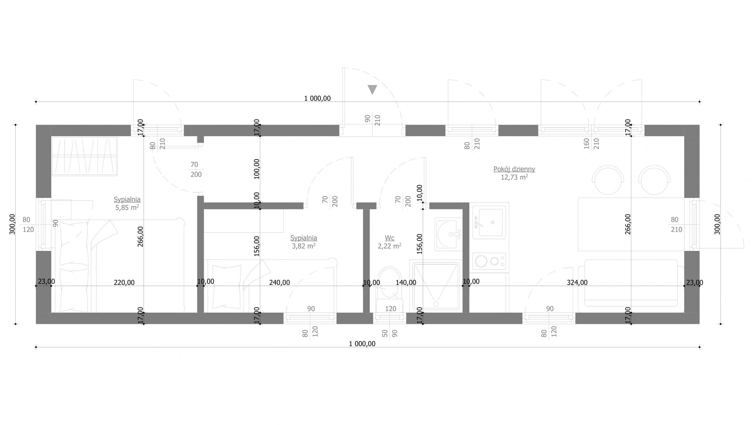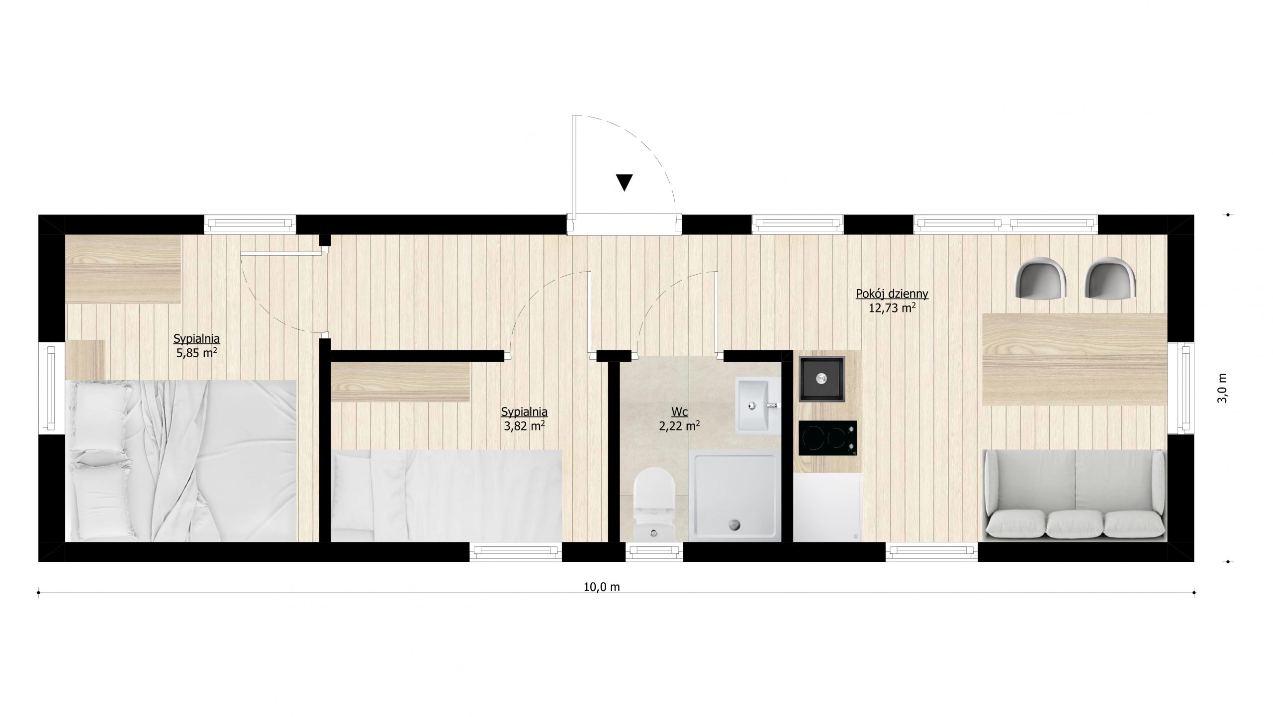 Opal can be a year-round or holiday home. It does not require a building permit and is delivered to the site ready-made, in one piece. Users can choose whether they receive the developer version or the turnkey version.Version for 3 people: two bedrooms, a mezzanine, a living room with a sofa bed, a kitchenette, and a bathroom.