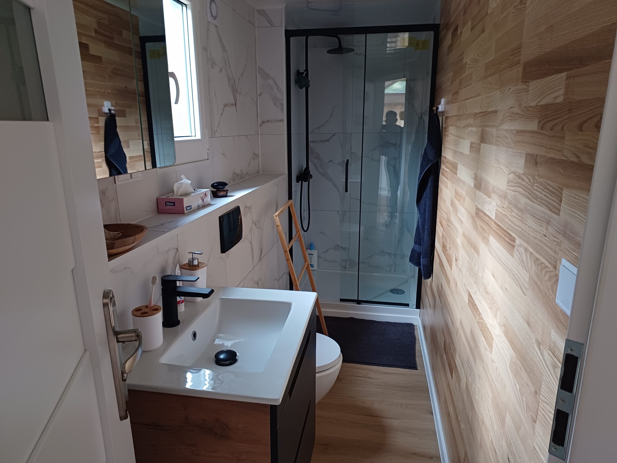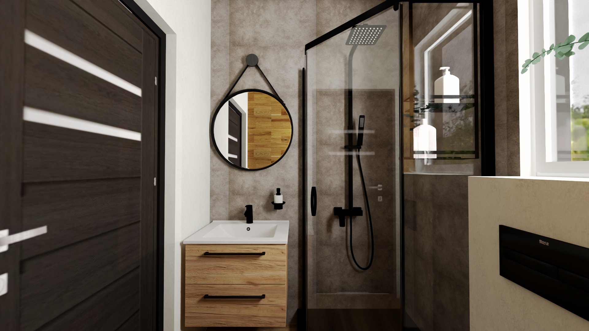 Floor and wall finishes – waterproof vinyl panels.The room is prepared for the installation of fixtures, optionally – a version with full installation (sink, toilet, shower cabin, washing machine, water heater (flow-through/boiler), bathroom cabinets)