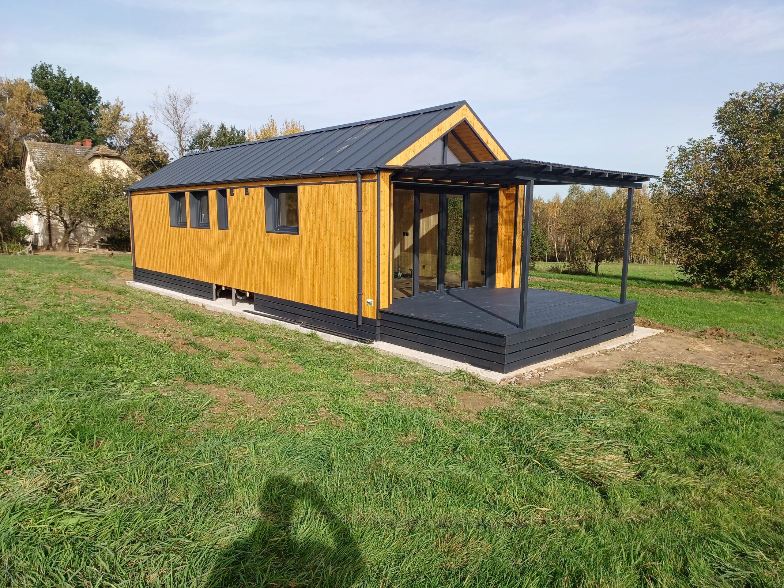 Steel with wooden elements. The building has two axes of removable wheels (in the mobile version).RoofSingle-pitched, finished with steel roof tiles or standing seam metal sheets. Eaves, gutters, and downspouts (visible or hidden). Layers are listed from bottom to top – ceiling finishing cladding, OSB boards, roof trusses, PUR foam insulation, vapor-permeable membrane, ventilated air gap, auxiliary framework, roofing.