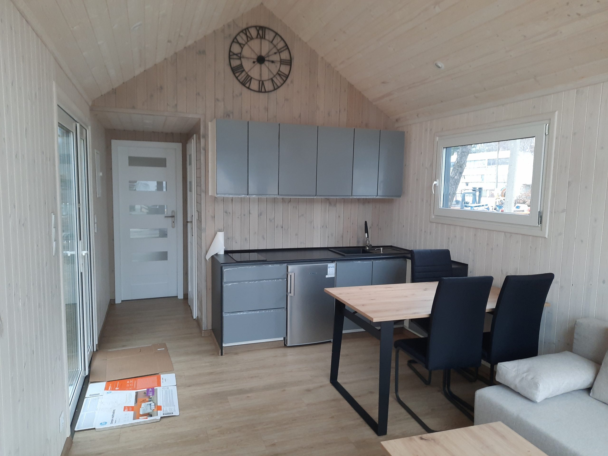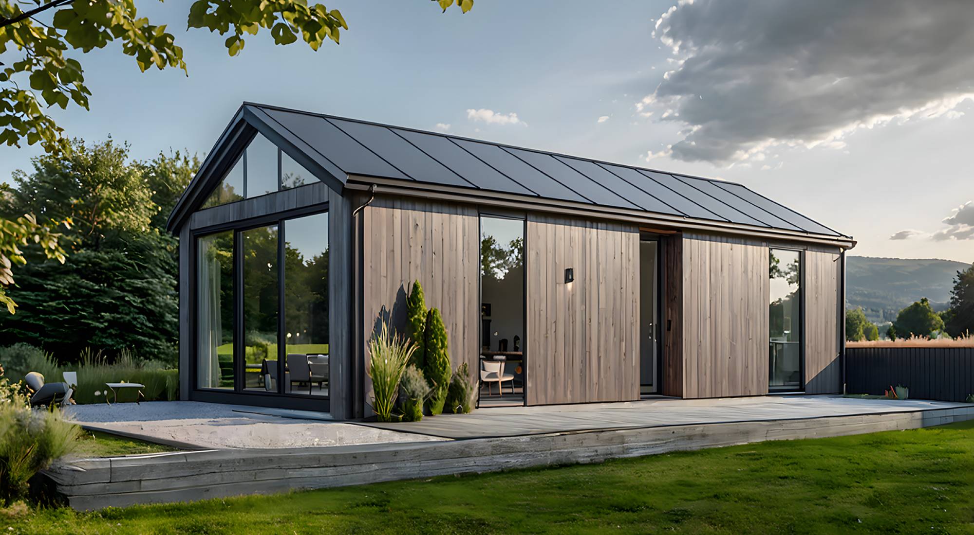 Steel with wooden elements. The building has two axes of removable wheels (in the mobile version).RoofSingle-pitched, finished with steel roof tiles or standing seam metal sheets. Eaves, gutters, and downspouts (visible or hidden). Layers are listed from bottom to top – ceiling finishing cladding, OSB boards, roof trusses, PUR foam insulation, vapor-permeable membrane, ventilated air gap, auxiliary framework, roofing.
