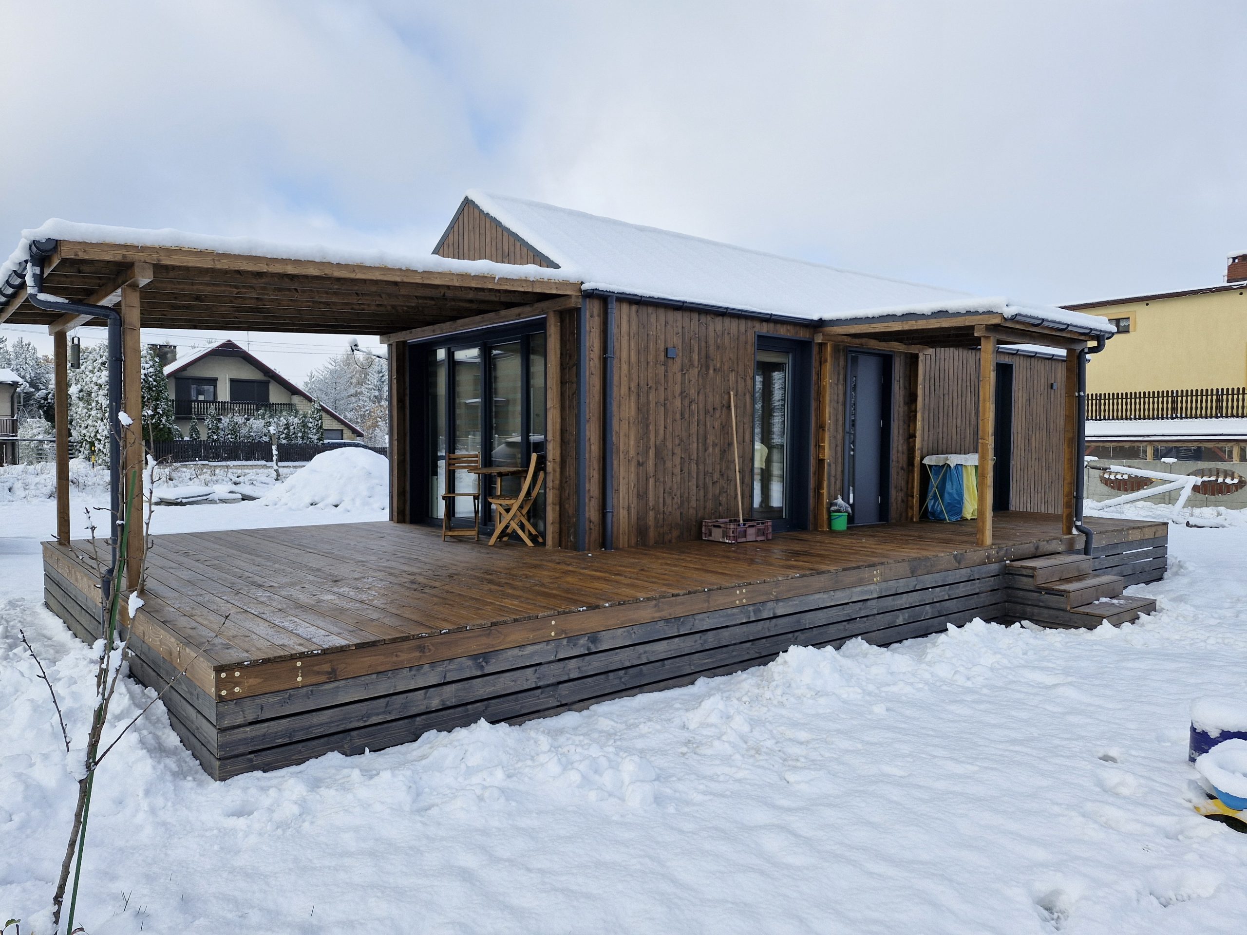 Rubin is durable and convenient to use – both as a year-round house and a holiday home. Its steel-wood construction performs well over years of use. The aesthetics are ensured by modern vinyl cladding, wood, Scandinavian spruce, and anthracite sheet metal panels. The design can be customized to individual requirements, and the ready-made house is delivered in its entirety to the site without going through the building permit process.
