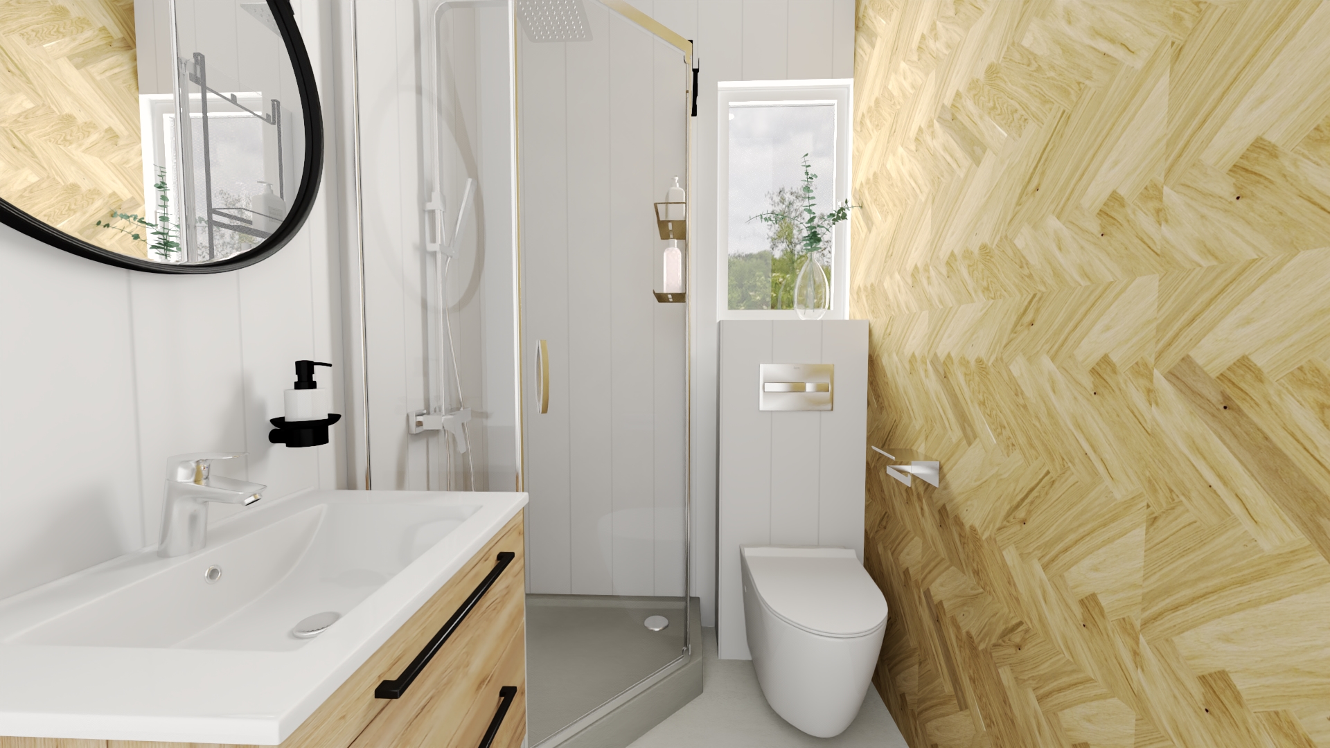 Floor and wall finishes – waterproof vinyl panels.The room is prepared for the installation of fixtures, optionally – a version with full installation (sink, toilet, shower cabin, washing machine, water heater (flow-through/boiler), bathroom cabinets)