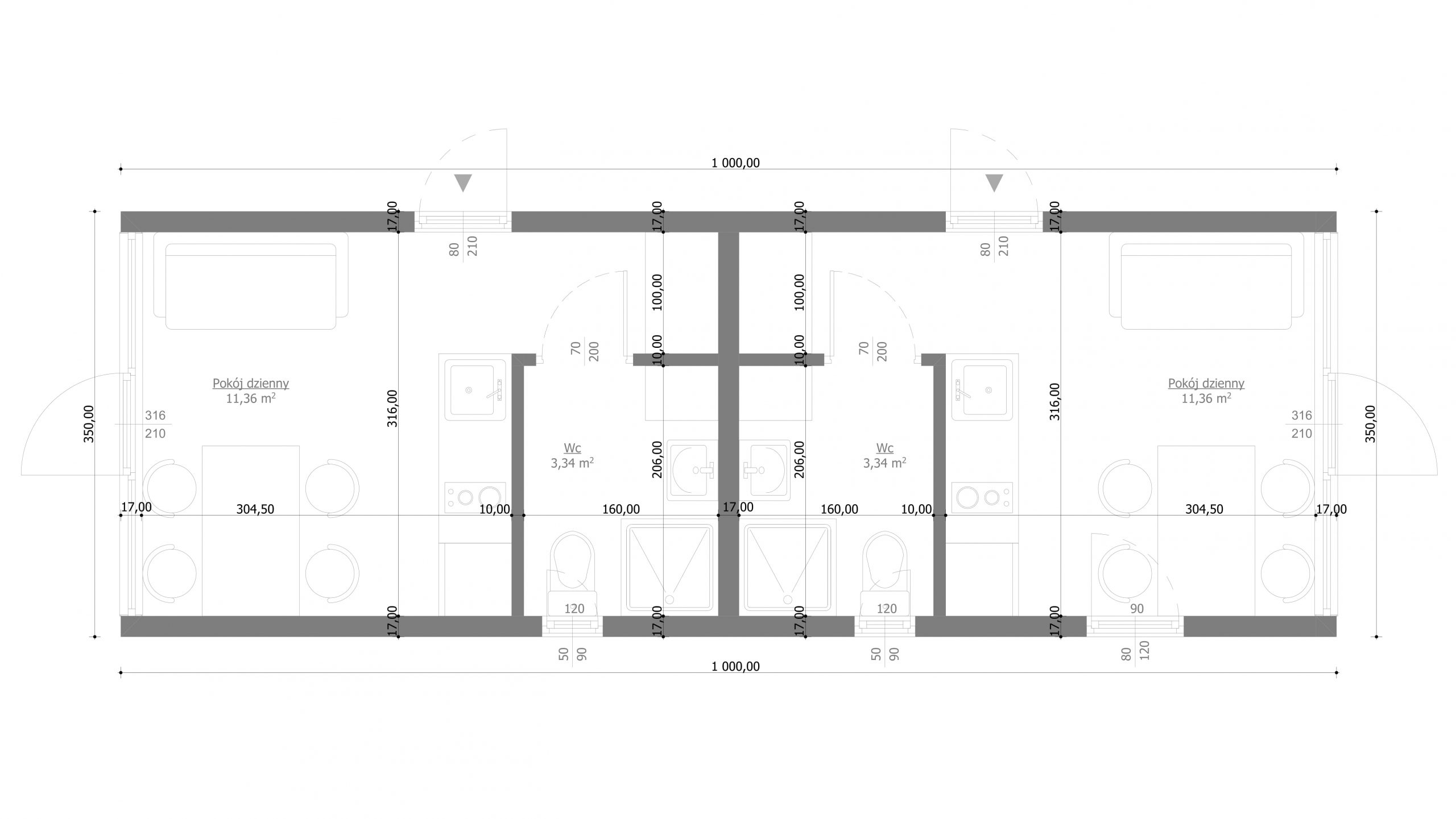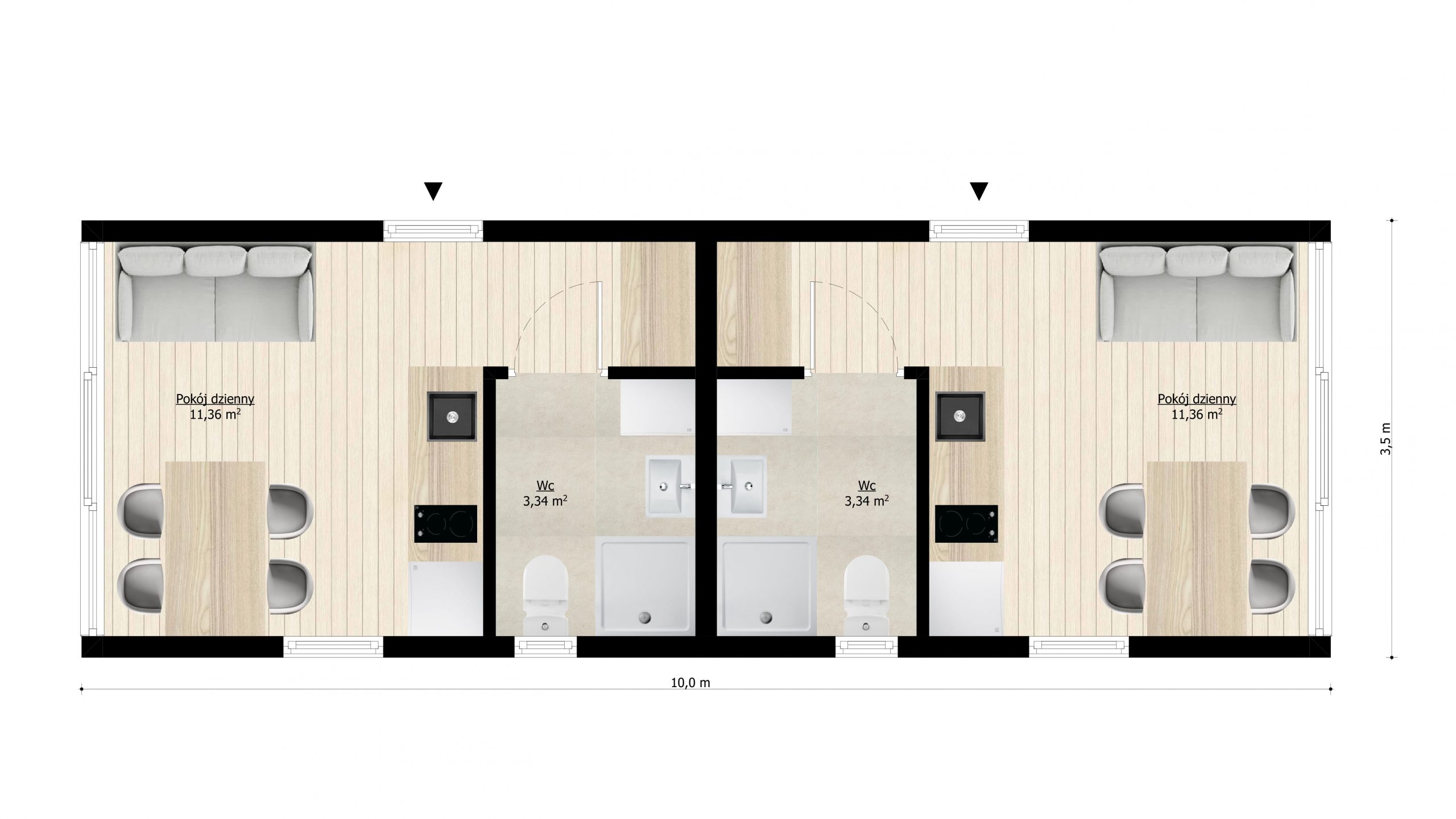 Version 2 + 2: 2 x living room with a pull-out sofa, a kitchenette, and a bathroom.
