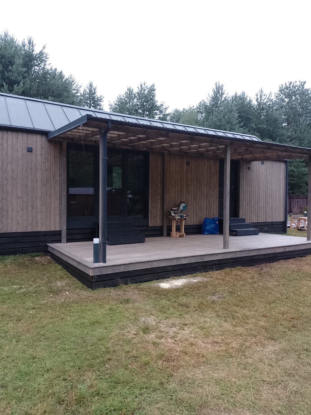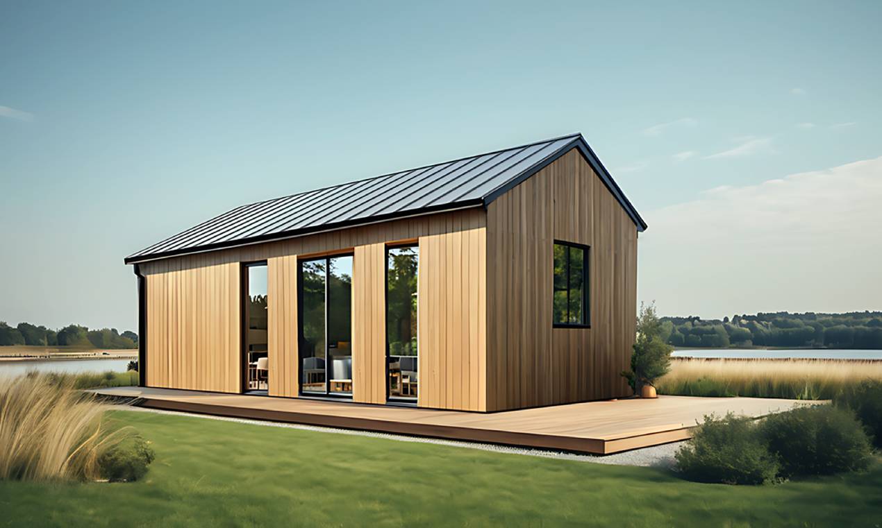 Steel with wooden elements. The building has two axes of removable wheels (in the mobile version).RoofSingle-pitched, finished with steel roof tiles or standing seam metal sheets. Eaves, gutters, and downspouts (visible or hidden). Layers are listed from bottom to top – ceiling finishing cladding, OSB boards, roof trusses, PUR foam insulation, vapor-permeable membrane, ventilated air gap, auxiliary framework, roofing.