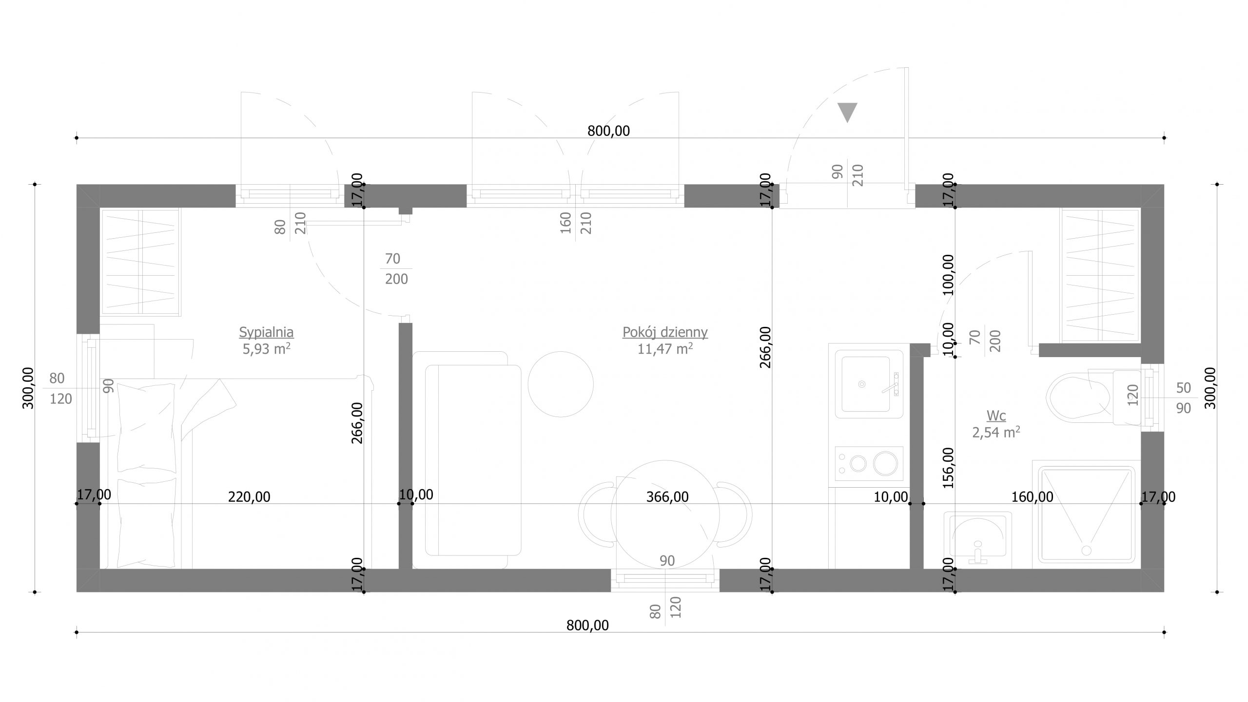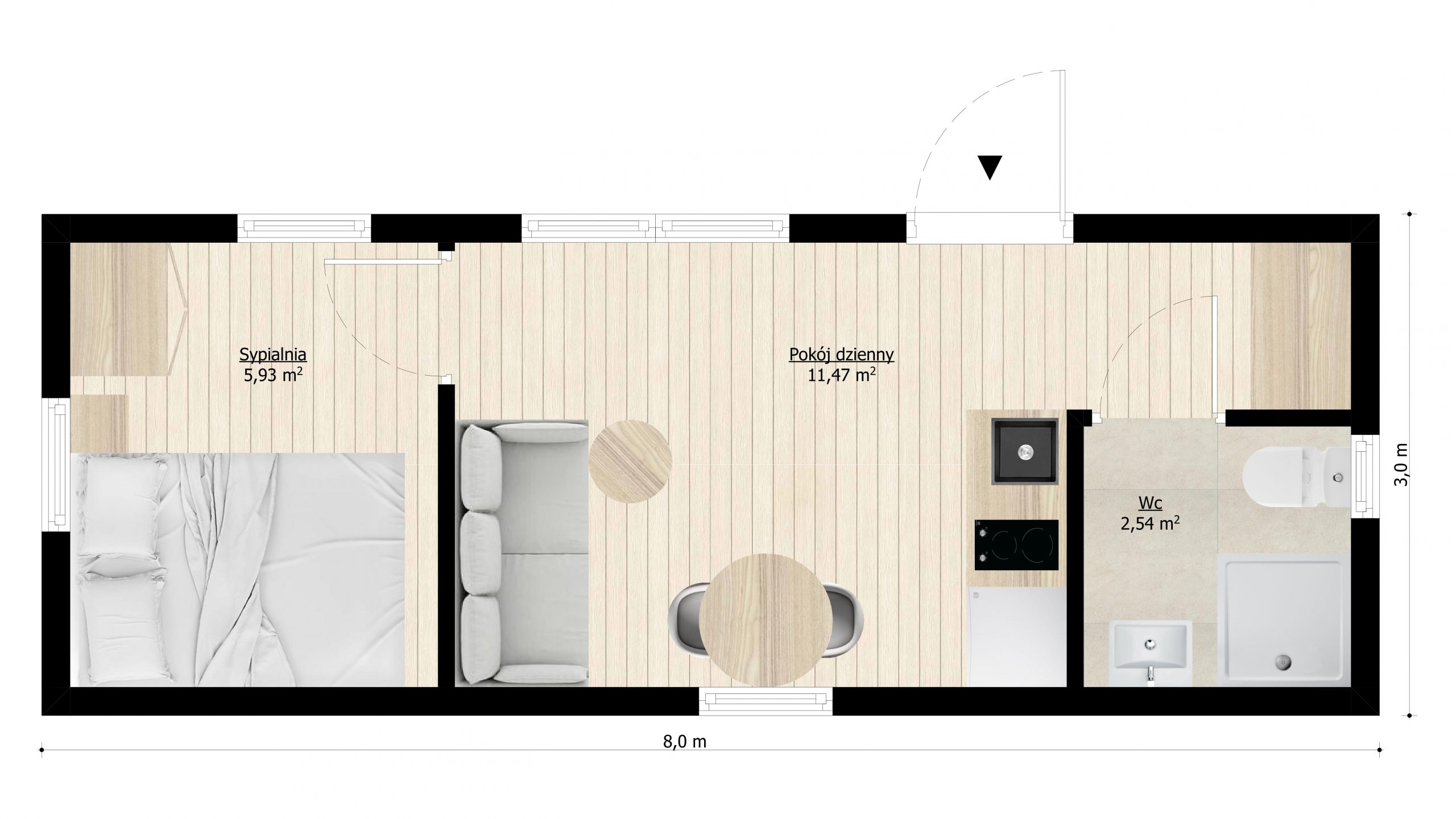 Version for 2 people: bedroom, living room with a fold-out sofa, kitchenette, and bathroom.