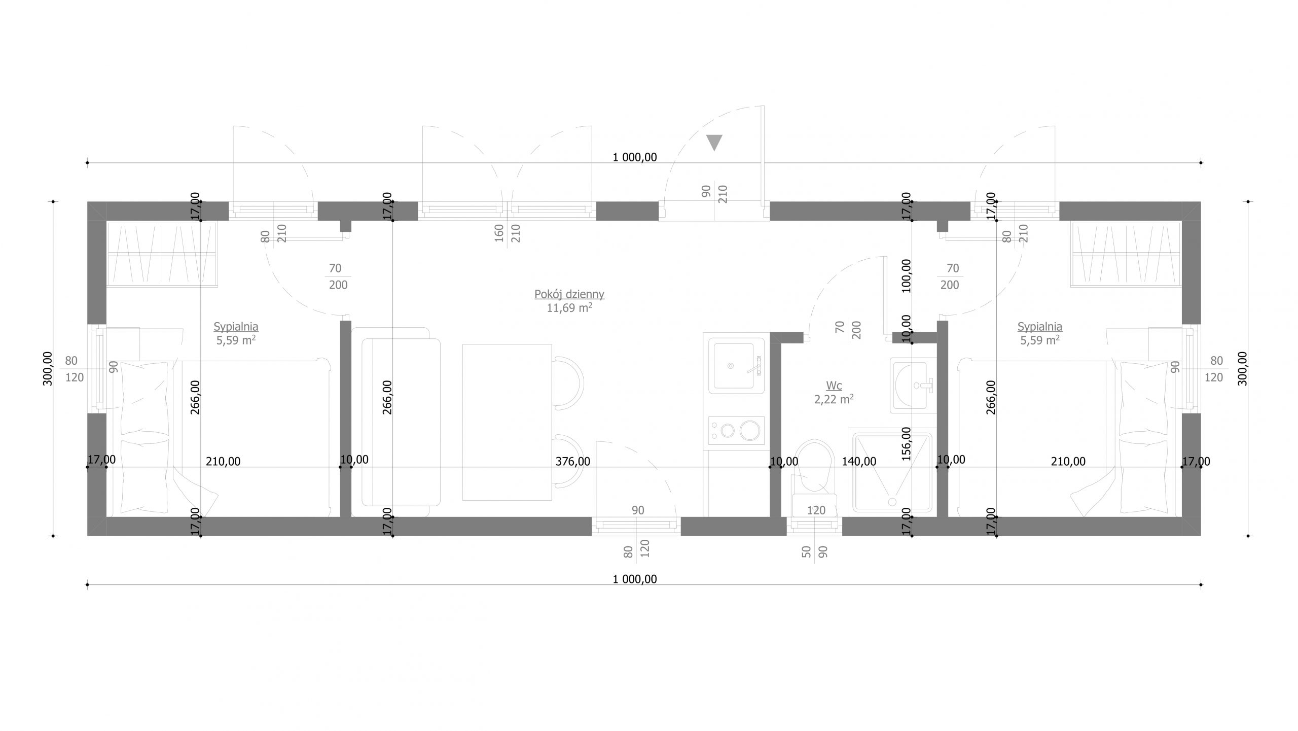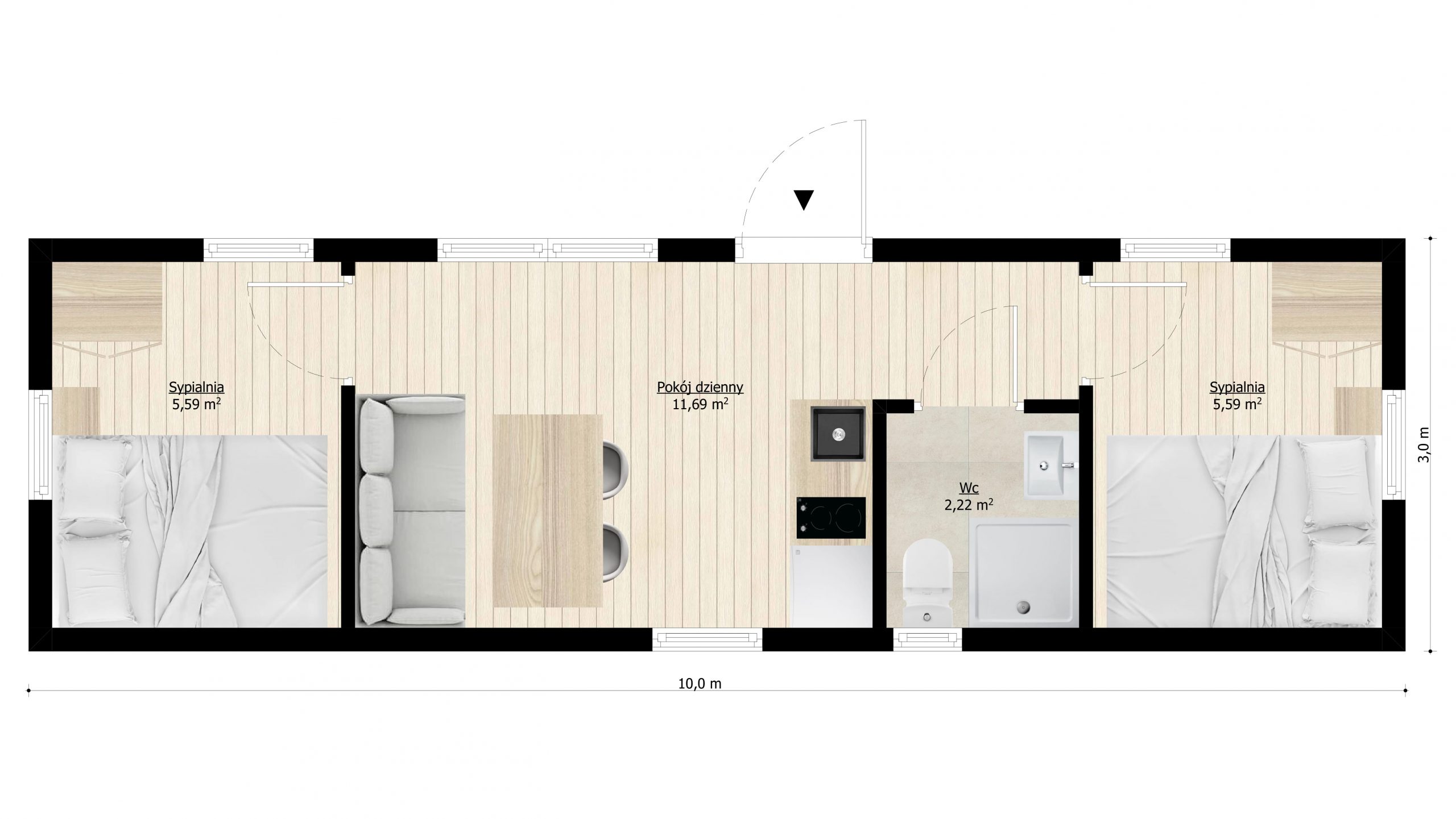 Sapphire is a proposal for year-round or summer mobile homes, offering a great alternative to traditional Dutch houses.Version for 4 people: two bedrooms, a living room with a sofa bed, a kitchenette, and a bathroom.