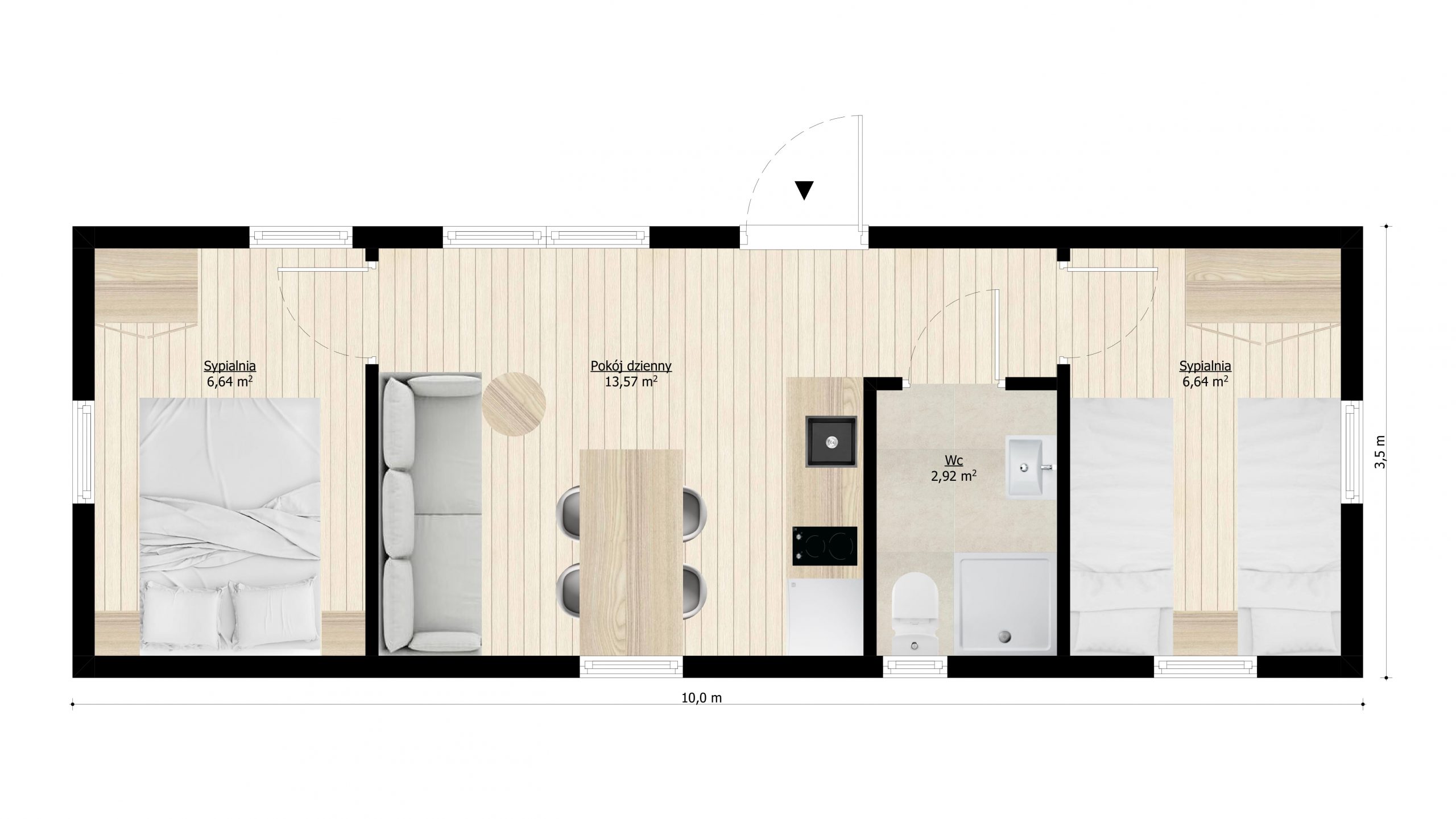 Sapphire is a proposal for year-round or summer mobile homes, offering a great alternative to traditional Dutch houses.Version for 4 people: two bedrooms, a living room with a sofa bed, a kitchenette, and a bathroom.