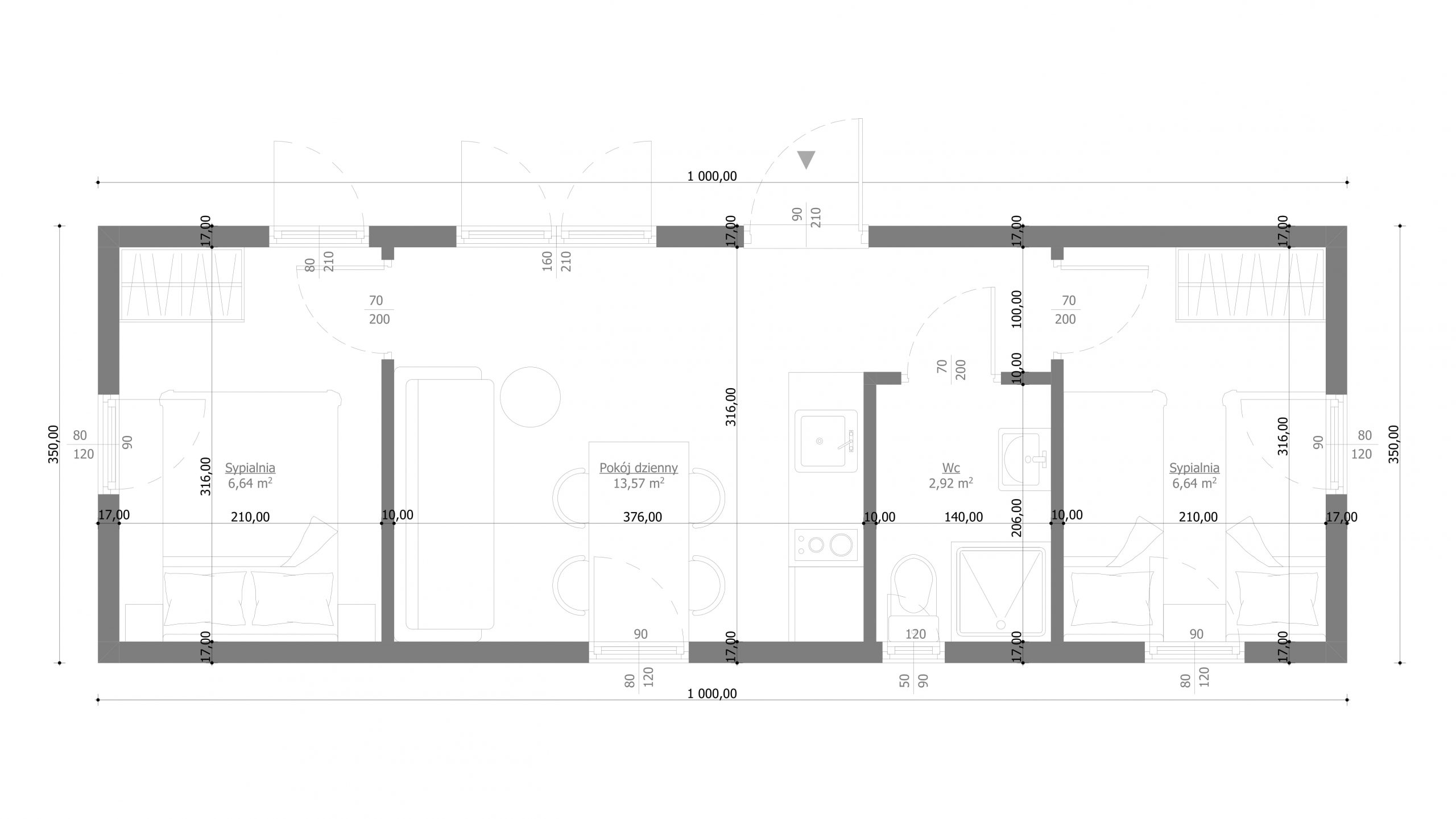 Steel with wooden elements. The building has two axes of removable wheels (in the mobile version).RoofSingle-pitched, finished with steel roof tiles or standing seam metal sheets. Eaves, gutters, and downspouts (visible or hidden). Layers are listed from bottom to top – ceiling finishing cladding, OSB boards, roof trusses, PUR foam insulation, vapor-permeable membrane, ventilated air gap, auxiliary framework, roofing.